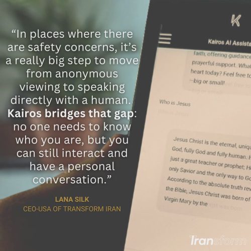 In places like Iran, Kairos is meeting a very real need that a human can’t do as effectively right now. Silk says there are people across Iran who are afraid to text, email, or call Transform Iran because of government tracking. When people go online, Transform Iran offers a free, safe and reliable VPN to help them access Kairos and ask their questions. She says it’s not a replacement for human discipling, but it is a tool they hope will bolster the Church.
